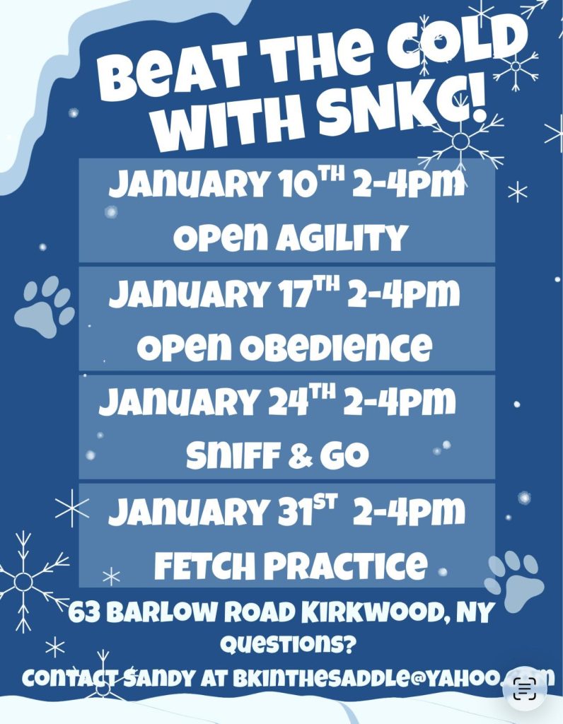 The next meeting of the Susque-Nango Kennel Club will be held on January 27, 2026. The Board meeting will commence at 6:00 p.m. followed by the General Meeting at 7:00 p.m. The meeting will be held via ZOOM meetings. Links will be mailed to all members. Guests are welcome and should contact a member of the Board of Directors for a link.