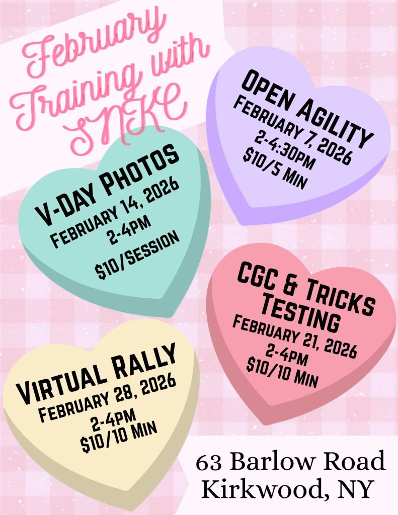 Susque-Nango Kennel Club training classes have moved to 63 Barlow Road, Kirkwood, NY. New classes have been added along with the usual favorites.